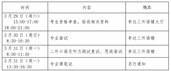 2.复试采用笔试和面试相结合的方式。笔试为专业知识测试(含同等学力加试)。面试主要包括思想政治素质和品德考核、英语口语及听力测试、专业能力面试等,重点考察考生的科研能力及创新意识;专业学位考生侧重对其专业知识应用水平、实践经验和科研动手能力等方面的考核。