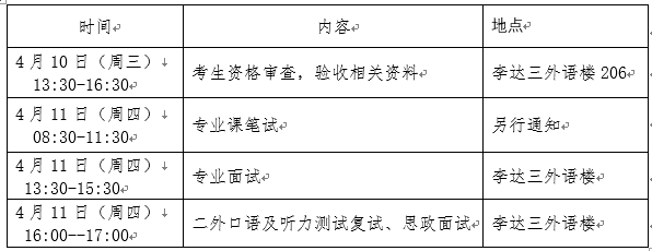 2.复试采用笔试和面试相结合的方式。笔试为专业知识测试(含同等学力加试)。面试主要包括外语口语与听力测试、专业与综合面试以及思想政治面试等,重点考察考生的科研能力及创新意识;专业学位考生应侧重对其专业知识应用水平、实践经验和科研动手能力等方面的考核。
