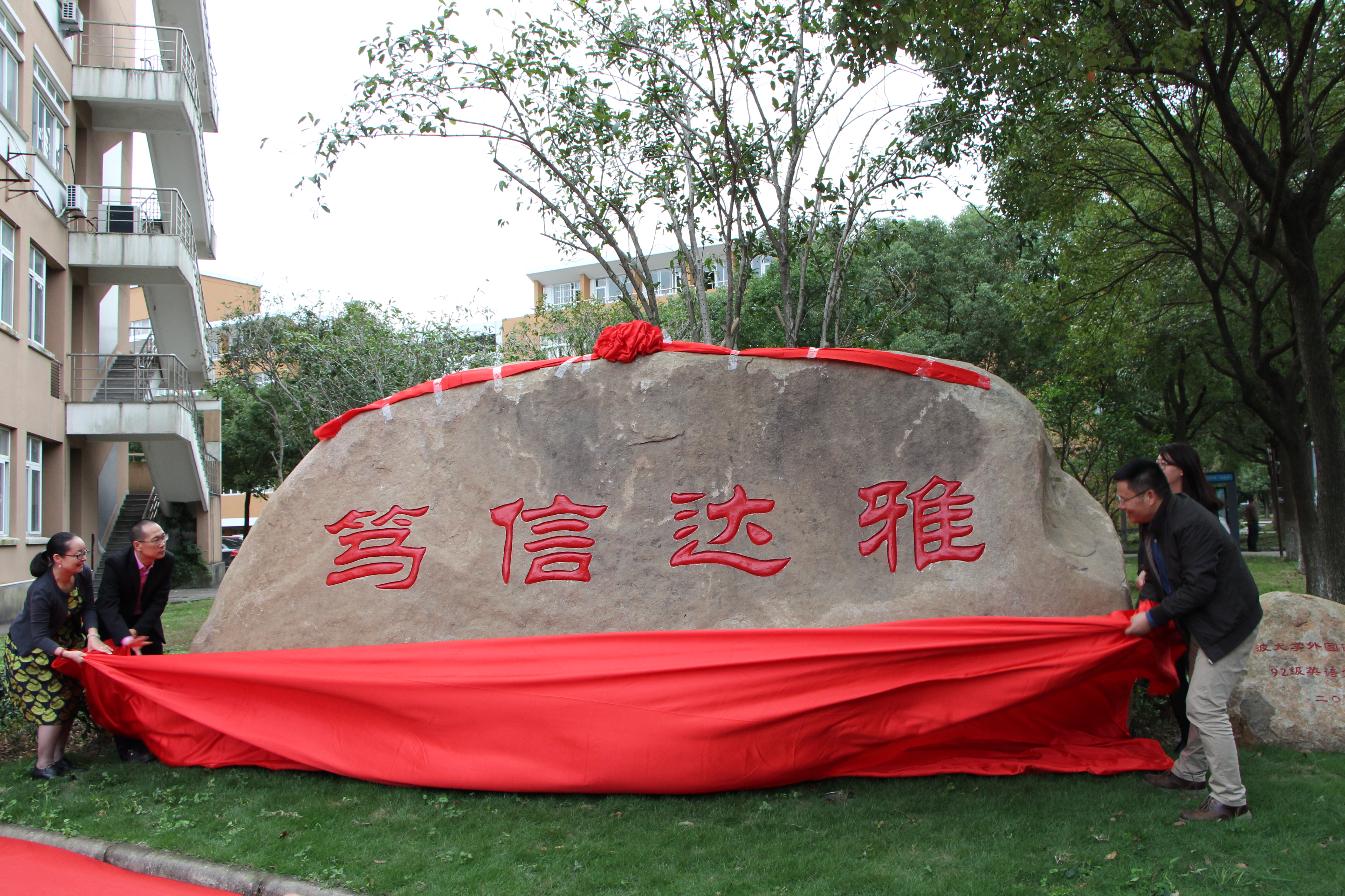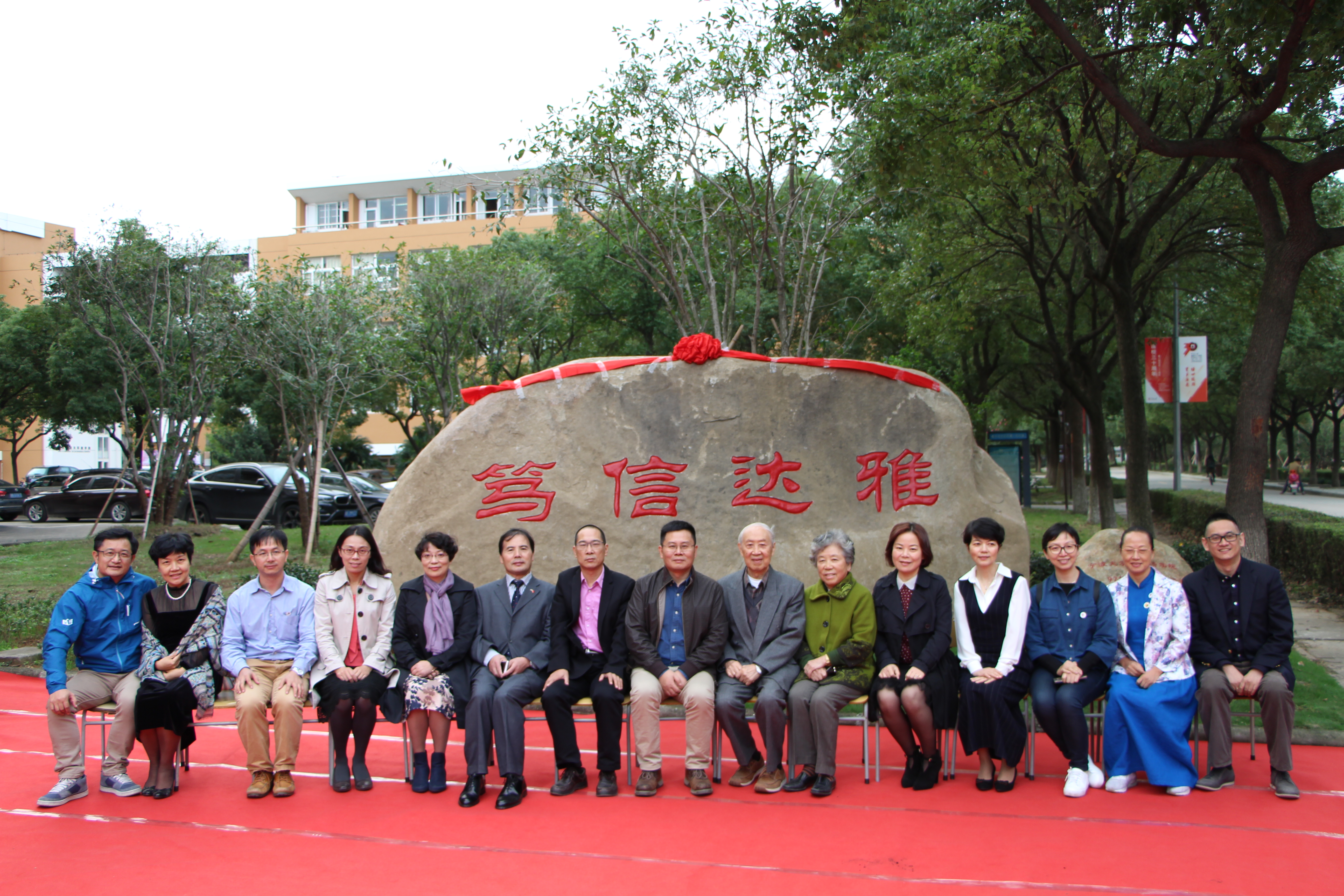 “笃信达雅”院训石揭幕仪式在学院小广场举行。学院领导班子成员、原外语系系主任胡荣昌、原外语系退休教师冯韵芳、各届校友代表以及学院师生代表参加揭幕仪式。院长屠国元致辞,介绍“笃信达雅”院训的来历和寓意并对捐赠院训石的学院1992级英语全体校友表示感谢;学院党委书记段汉武介绍了院训石捐赠过程;1992级英语校友胡英杰代表全体校友发言;最后屠院长、段书记以及两名92级英语的校友代表为“笃信达雅”院训石揭幕,并在院训石前合影留念。