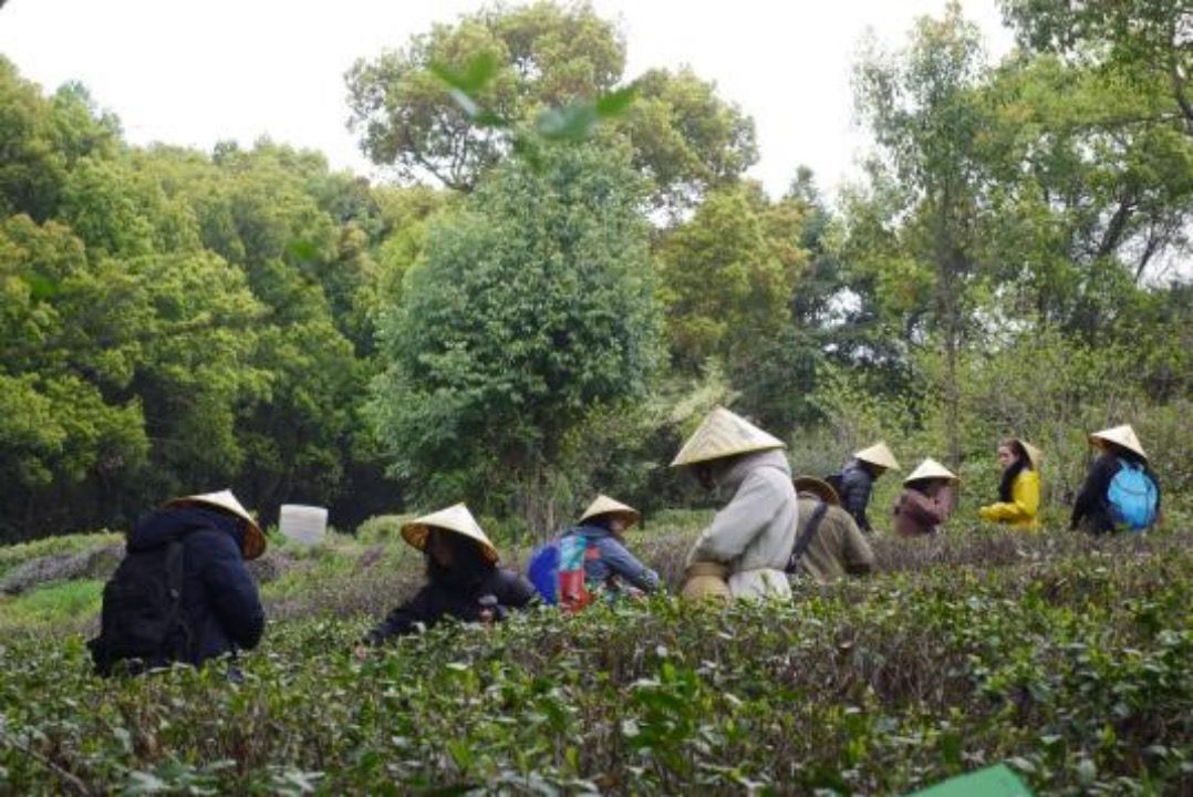 清晨的保国寺茶园绿意盎然,志愿者们和国际友人们头戴斗笠,腰系竹篓,在茶农的悉心指导下学习“两叶一芯”的采摘技巧。来自西班牙的丽娜小心翼翼地采摘着嫩芽,兴奋地说:“中国绿茶的采摘标准如此精细!这需要极大的耐心和专注。”