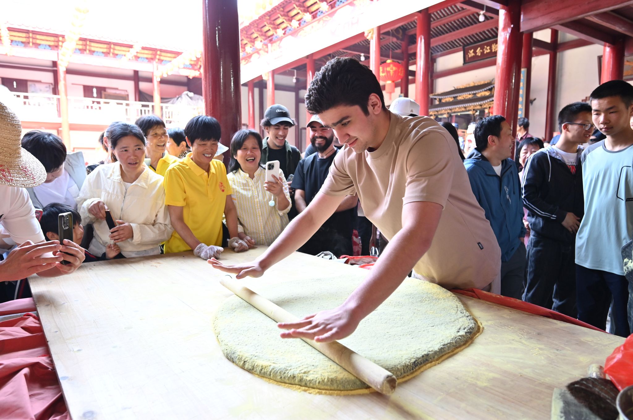 一旁的麦秸画制作区里,金黄的秸秆在同学们手中变身一幅幅传统图案;香囊手作台前,艾草清香四溢,伴随着穿针引线的沙沙声,充满东方韵味的手作渐渐成型。这些传承千年的非遗技艺,让大家由衷感叹每一道工序里都藏着对自然的敬畏。非遗市集上,鱼灯、戏曲脸谱等手工艺品琳琅满目,柴火灶上麻糍香气扑鼻,引得游客纷纷驻足。原来,捣麻糍可不只是“四月八”的传统美食,更承载着“犒劳耕牛、感恩丰收”的深厚文化寓意,而我们——新时代中外青年的参与,也为这份农耕记忆赋予了新的时代色彩。