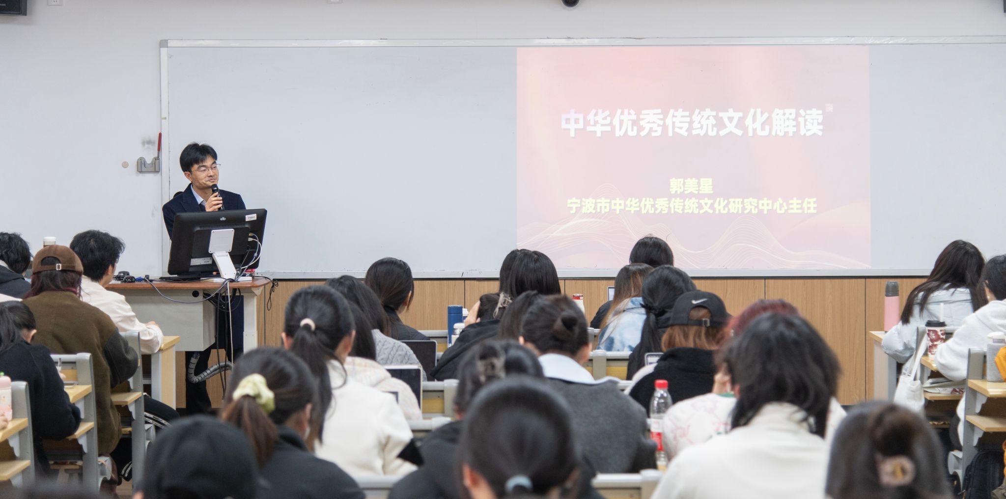 缓缓拉开帷幕。作为“中华思想文化翻译本科一流团队‘专家进课堂’系列活动”的重要组成部分,学院特邀宁波市中华优秀传统文化研究中心郭美星主任,带来了一场题为“中华优秀传统文化解读”的精彩讲座。活动由贺莺教授主持。