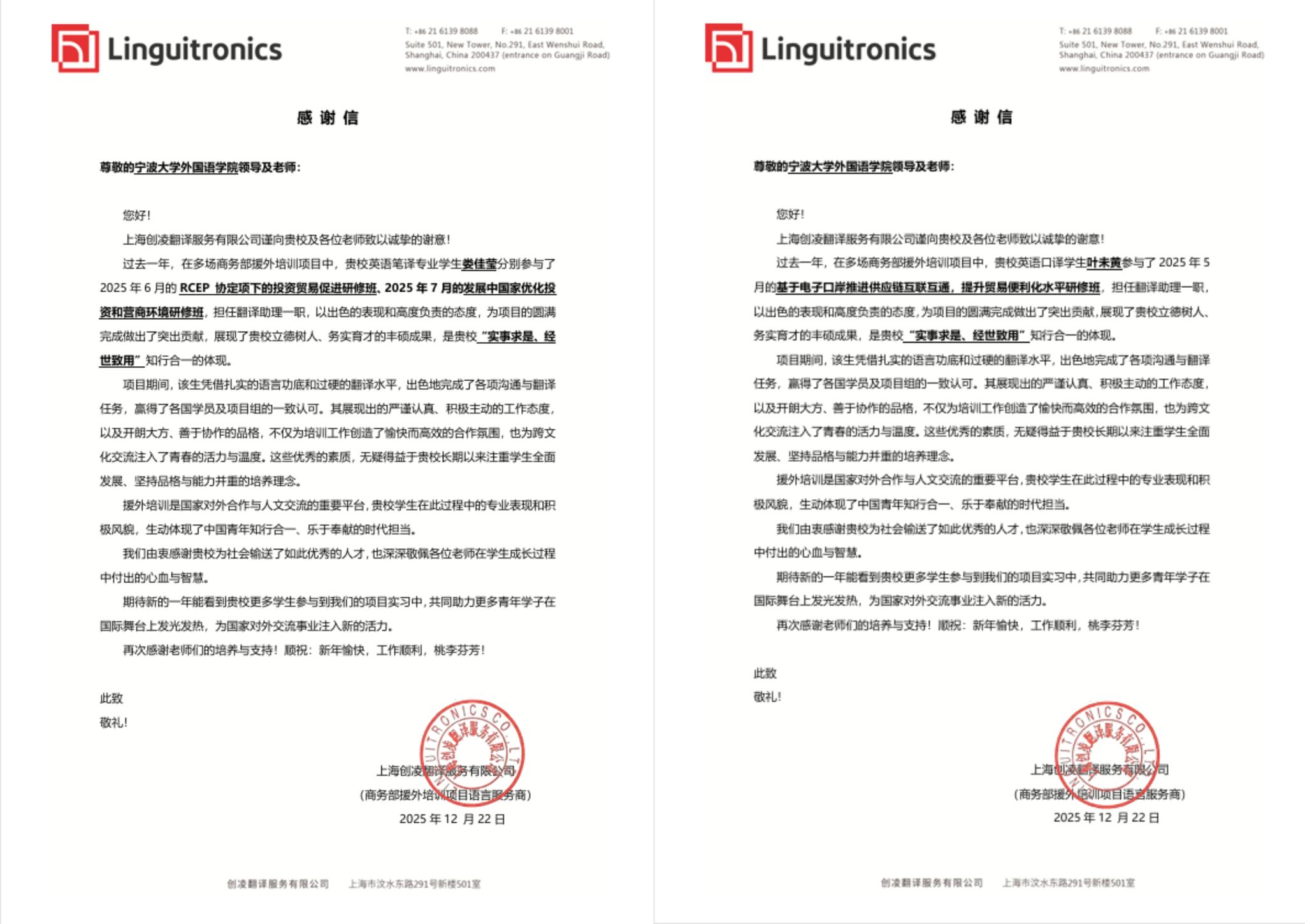 翻译硕士研究生叶未黄、娄佳莹,在参与上海商学院商务部援外培训基地组织的多项援外人力资源合作项目中,凭借扎实的专业能力、出色的跨文化沟通素养与高度的责任意识,获得项目承办单位的高度评价与书面感谢信,展现了学院在高级翻译与国际化人才培养方面的显著成效。