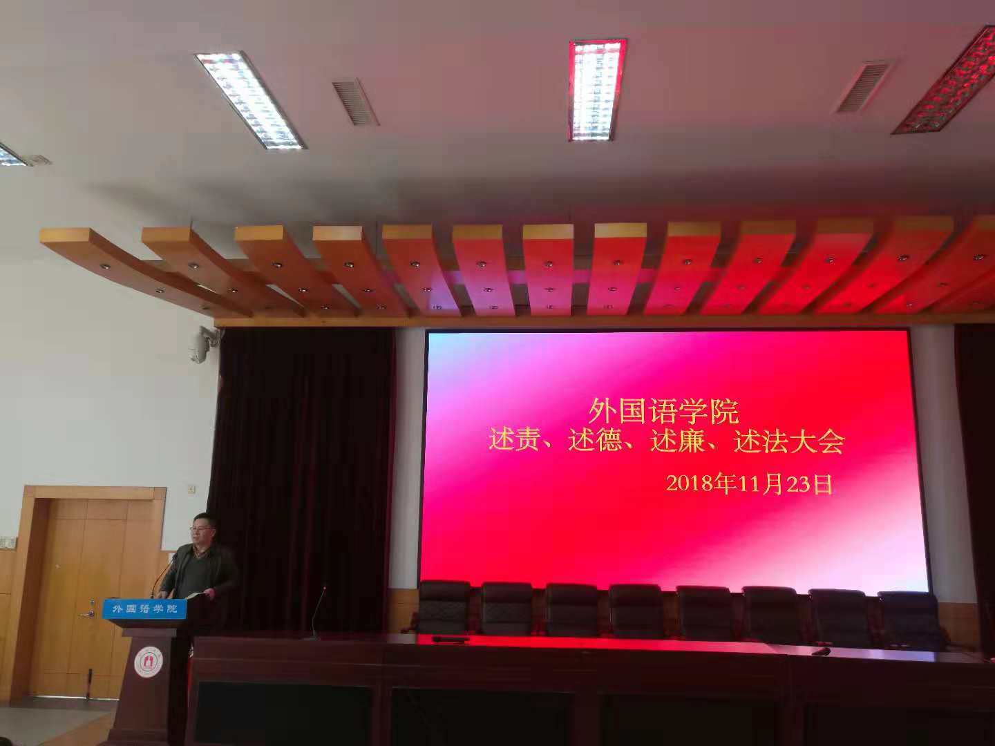 2018年度述责、述德、述廉、述法大会在李达三外语楼218报告厅召开,大会由学院党委书记段汉武主持,学院全体教职工参加了此次大会。
