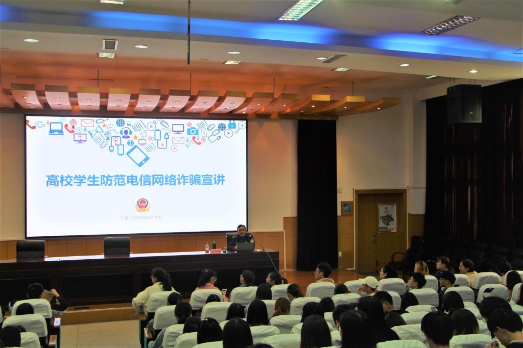 防范电信网络诈骗专题会议在李达三外语楼218报告厅召开。此次会议由学工办陈文祎老师主持,宁波市公安局江北分局王宏强警官主讲,伊人直播