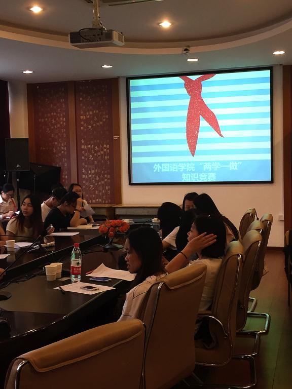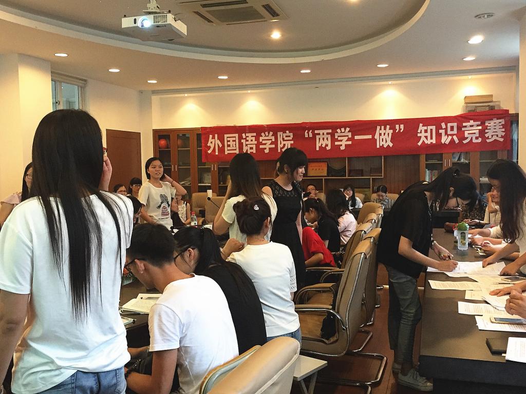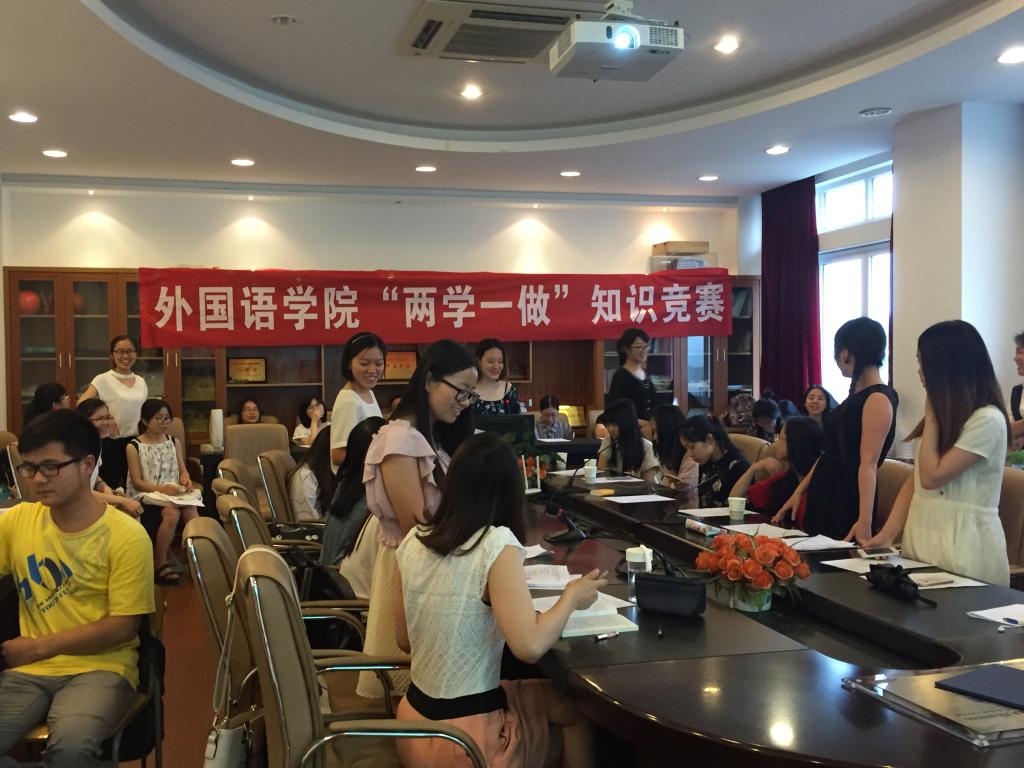各党支部代表在李达三外语楼422举行“两学一做”学习教育之“两学”知识竞赛。共有十五个党支部参加。最终,英语第四党支部、第二党支部和第一党支部分获一、二、三等奖,朱雪婷、李婷及吕潘婷获“优秀学员”称号。