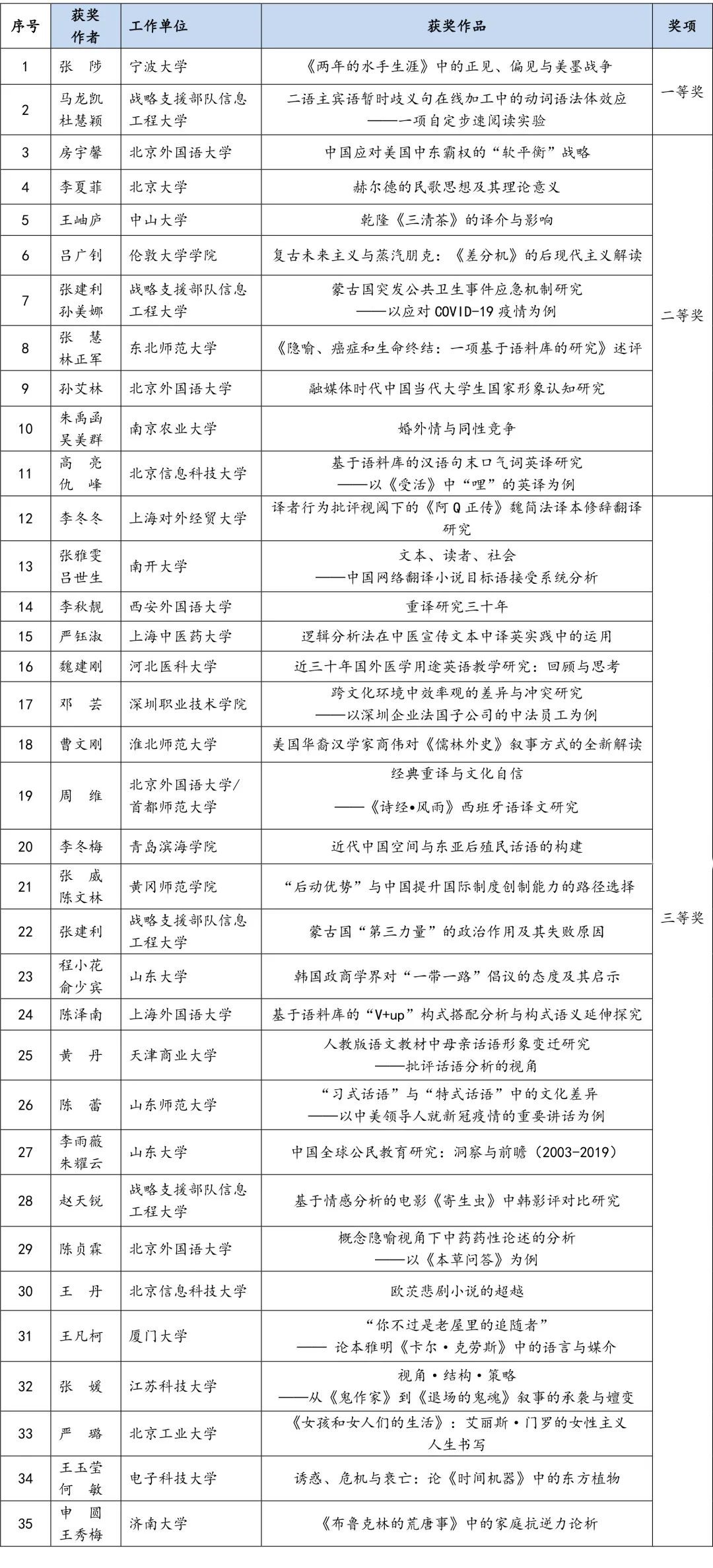 为支持全国高校外语教师学术研究,推动高校外语学科学术建设与创新,促进期刊编辑部与读者和作者的深度交流,外语教学与研究出版社与北京外国语大学各学术期刊编辑部共同举办了“第二届‘外研社杯’全国高校外语学科优秀学术论文评选”活动,共收到来自200多所高校师生的投稿论文298篇。经过北京外国语大学各学术期刊编辑部专家的严格审稿,在298篇参赛论文中共评出优秀作品35篇,其中一等奖2篇、二等奖9篇、三等奖24篇。