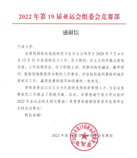 感谢信中写道:石玉玉同学于2020年7月6日至12月31日在亚组委竞赛部实习期间,服从部室安排,工作表现突出,学习积极主动,同事间相处融洽,赢得竞赛部领导和同事的一致肯定。信中还提出“贵校培养出以石玉玉为代表的优秀体育管理人才,为亚运竞赛组织工作做出了积极贡献。非常感谢伊人直播