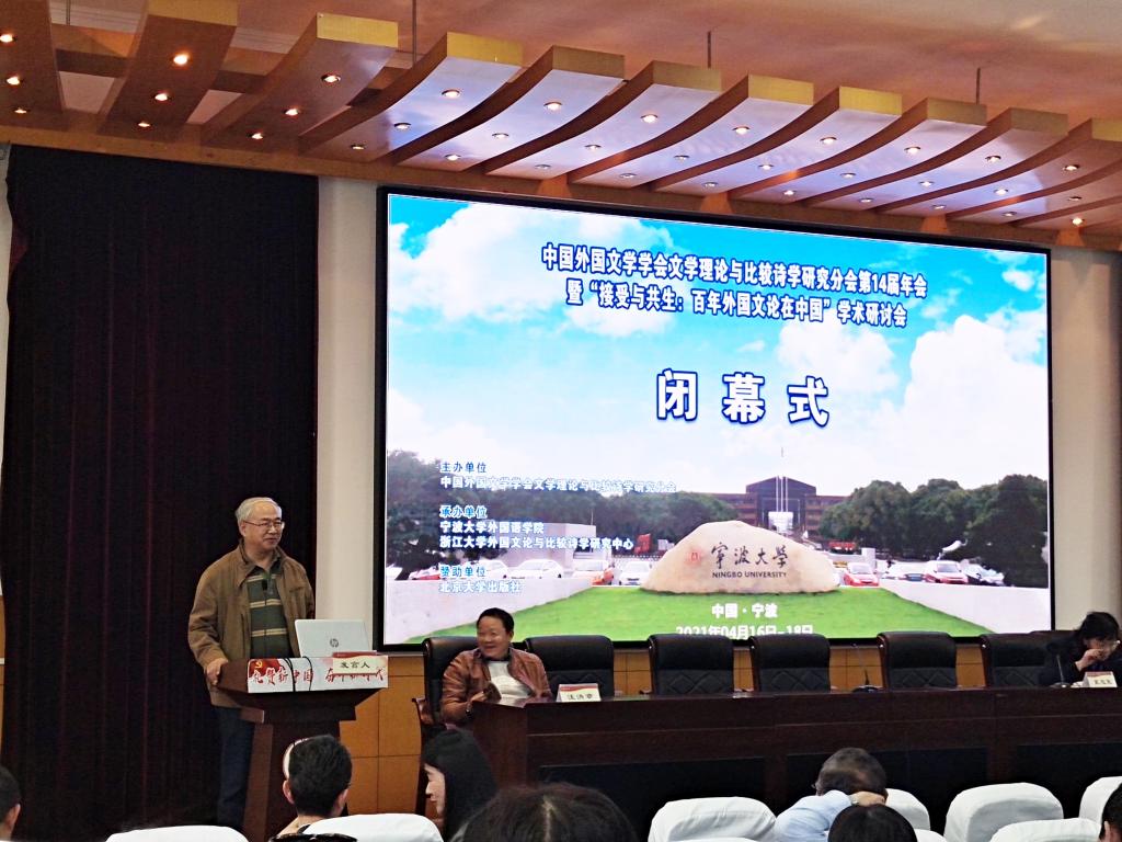4月18日上午的主题报告结束后,会议举行闭幕式。文学理论与比较诗学研究会副会长、北京师范大学夏忠宪教授致闭幕辞。中国外国文学学会副会长聂珍钊、中国中外语言文化比较学会会长吴笛、中国高等教育学会外国文学专业委员会会长刘建军、第8届高校科研优秀成果奖一等奖获得者,《中国外国文学研究的学术历程》主编陈建华等著名专家对本次会议高水平的学术研讨予以了充分肯定。