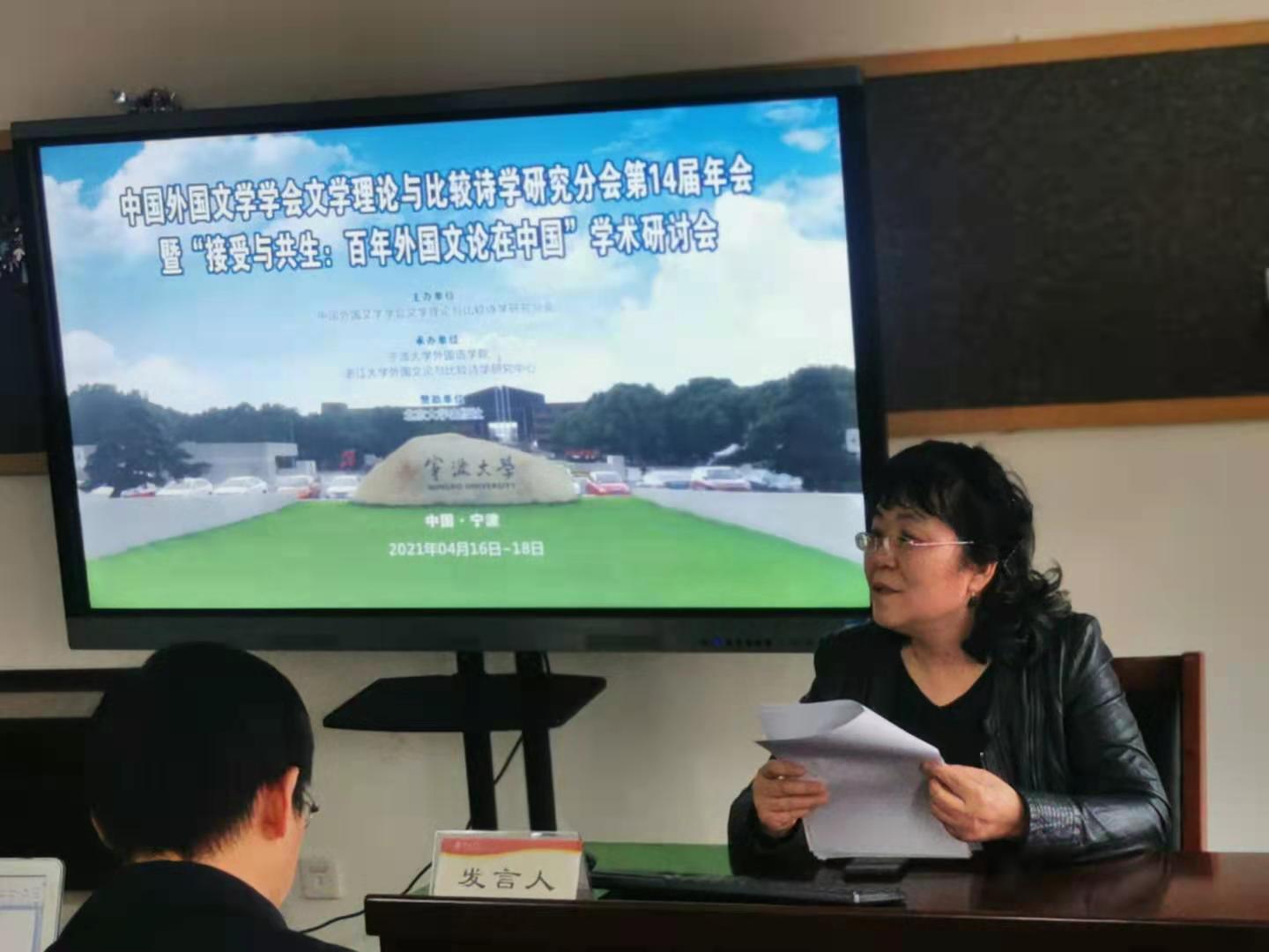 会议期间,专家们进行了14场大会报告。在4月17日上午的主会场有6场大会报告。中国人民大学耿幼壮教授做了“关于外国文论译介与研究的几个问题”的发言,就外国文论在中国接受过程中的内涵演变与发展倾向及其与中国元素的互动与融合进行了深入的阐述。浙江大学周启超教授介绍了国家社科基金重大项目“现代斯拉夫文论经典名篇汉译与大家名说研究”的进展与问题,展示了课题组阶段性研究成果,认为雅各布森百年前提出的“文学性”在文学研究中具有话语史、学术史、思想史价值,在今天的世界文学与比较文学研究实践中还有现实意义,强调外国文论引介要超越“粗放”,进入“深耕”。 北京外国语大学马海良教授在“西方文论的真理话语系统”的报告中,认为真理话语是西方文论的主导范式,广泛渗入文艺创作实践,而后现代文论实则上是对真理话语传统的反噬。浙江工商大学蒋承勇教授作了“‘现实’与‘浪漫’:矛盾中的‘勾连’”的演讲,就现实主义与浪漫主义的关系进行了深入的考辩,认为坚持现实主义本原性特质研究可为建构有中国特色的外国文学和文学理论学科体系、学术体系和话语体系提供支撑与支持。复旦大学汪洪章教授做了“关于中西形式论话语的一点比较”的报告,认为关于文学作品首尾圆合、有机一体的论述在中西文论史上历来有之,并以《文心雕龙》为例,与西方文论家的相关论述进行了比较探讨。上海大学曹谦副教授在“苏联审美学派及其争论与1980 年代中国文艺本质的讨论”的报告中,认为上世纪八十年代苏联美学和文论特别是苏联“审美学派”及其争论的译介研究与我国当代文论转型发展构成了相互促进的互动关系。兰州大学朱刚教授作了题为“理论可以‘旅行’吗?”发言,就赛义德的“Traveling Theory”(一般译为“旅行理论”)的准确译法从词源上做了解析,认为“Traveling ”应该译为“飘移”更为贴切,因为“飘移”本身所含的播撒性、互动性、地域性和批判性都与赛氏的后殖民理论相契合。