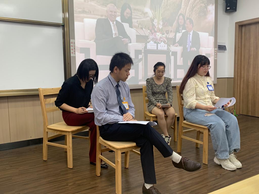 活动开始前十分钟,外事中心代表将中文发言稿等内容分发给扮演中方发言人、中方译员、外方译员的6名同学以供译前准备。随后,汪玉琼副主任宣布活动开始,她首先向各位同学表达了问候与欢迎,并就即将要开展的外事模拟活动中内宾外宾的接待礼仪做简要介绍。紧接着,模拟实战活动开始,中方发言人、外方发言人、中方译员、外方译员依次上场进行发言及口译,充分调动观众热情,气氛热烈。