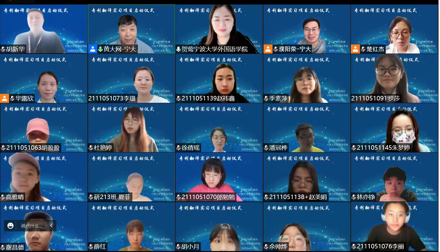 举行知识产权出版社专利翻译实习项目启动仪式。知识产权出版社语言服务部主任胡新华,英语组组长楚红杰出席。翻译硕士专业学位点负责人贺莺教授、翻译硕士教育中心濮阳荣副主任,以及参加专利翻译实习的一二年级翻译硕士研究生共60余人在云端出席启动仪式。仪式由翻译硕士教育中心黄大网主任主持。