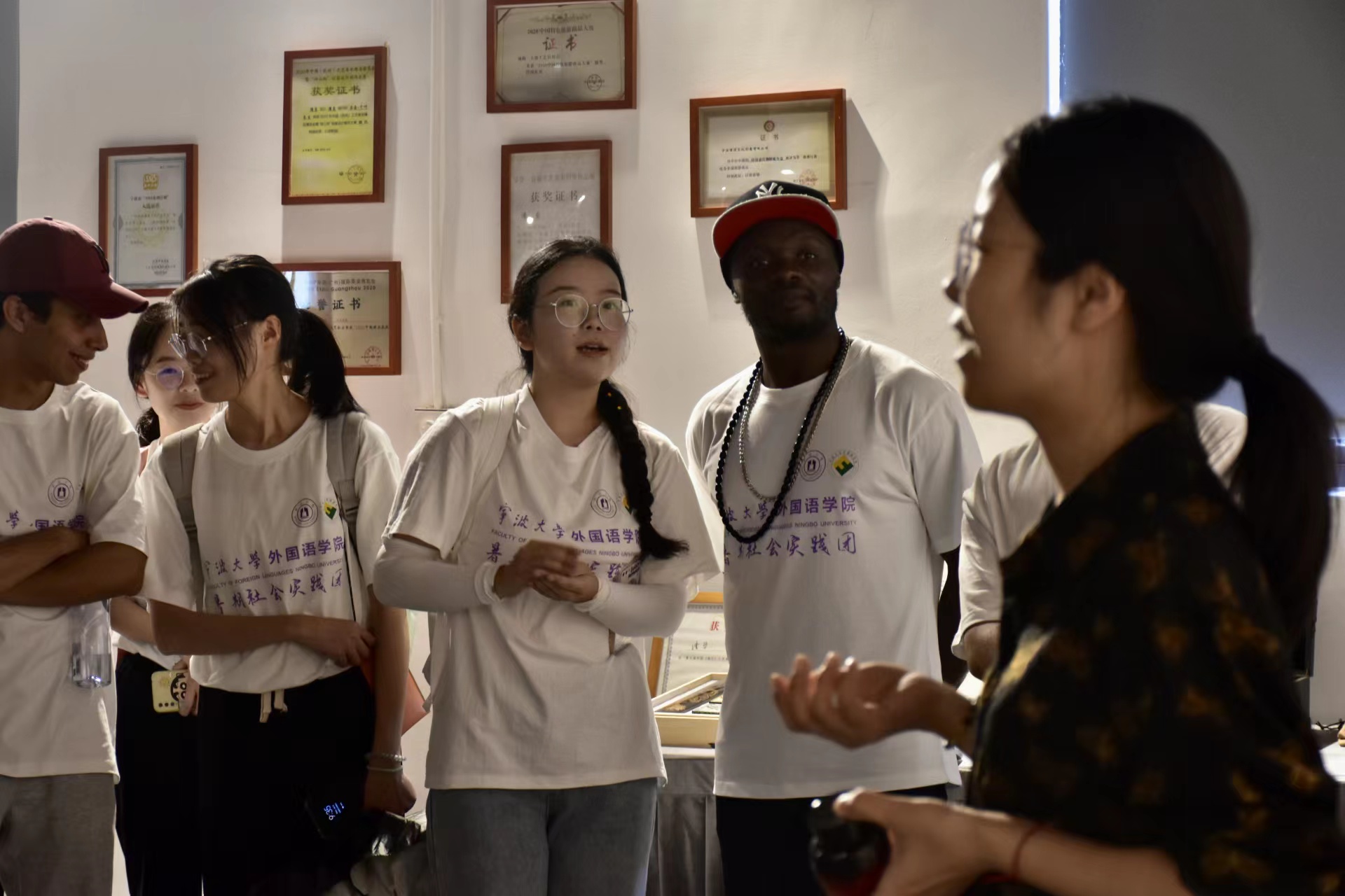在天通老街的海丝寻迹文化馆,中外大学生进一步了解了海上丝绸之路的发展历史和宁波在建筑文化、茶文化、陶瓷文化等方面与东南亚国家的交流。其中“无钉之殿”所体现的古代传统建筑智慧——榫卯结构,给团队成员们和留学生们留下了深刻印象。巴布亚新几内亚的留学生Monica参观结束后说道:“The Maritime Silk Road-it was a road that had been used like before the Ming Dynasty, and it has been used purposely for trade. It's important that the Maritime Silk Road has been preserved as a remnant of the past to remember. I like it's been preserved, and it's still there as a place people can go and visit.” (海上丝绸之路在明朝以前就开始使用了,对贸易往来很重要。而且重要的是,海丝遗迹被保存下来,我喜欢它被保存下来,它仍然在那里作为一个人们可以去寻迹的地方。)