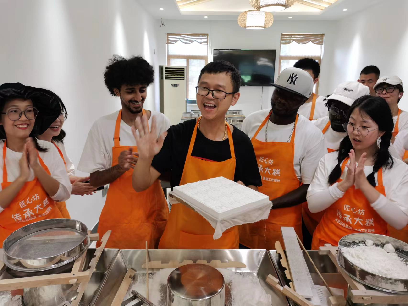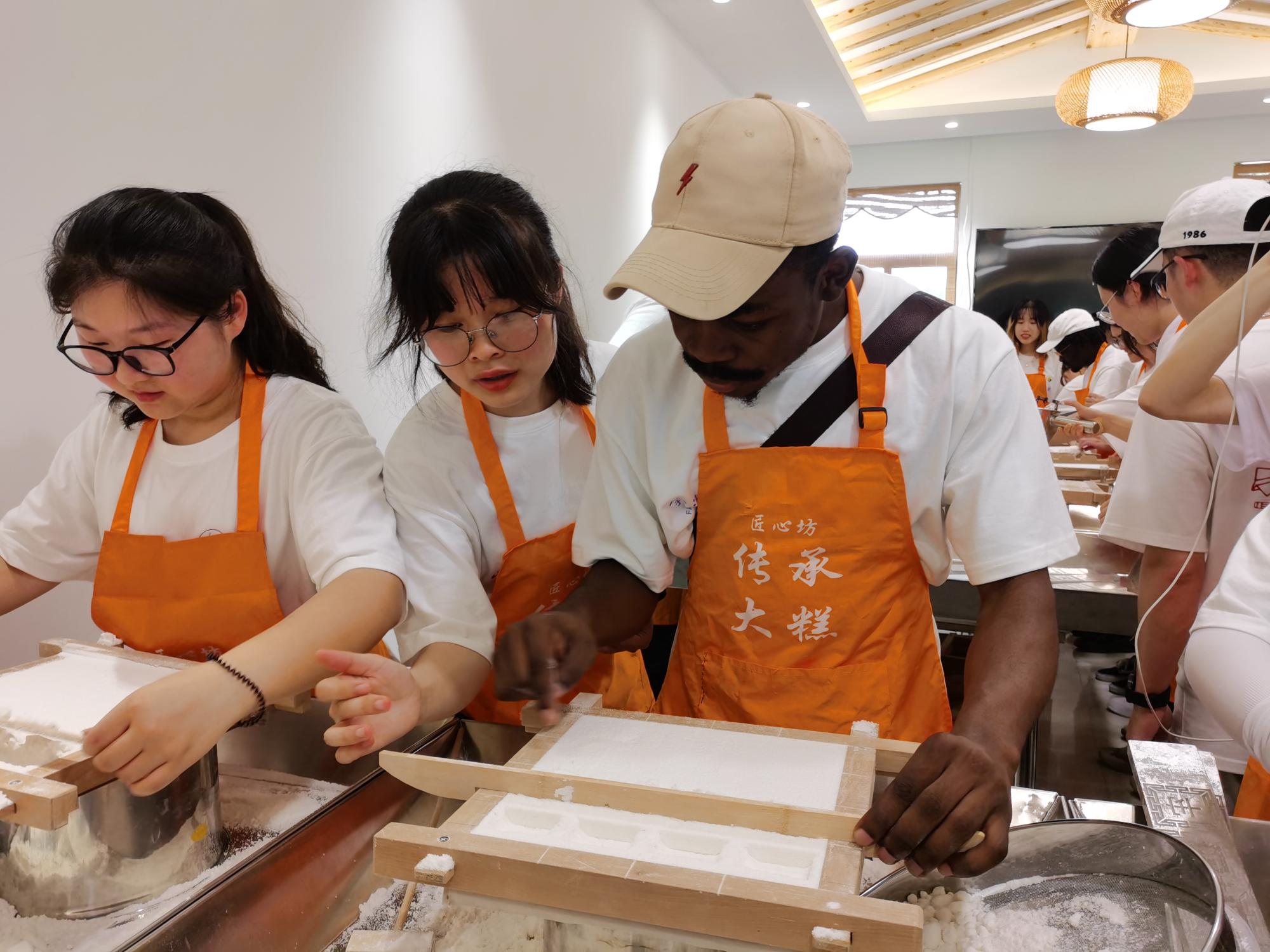 当地著名的美食——梁弄大糕,自然是中外大学生此行都不能错过的。梁弄大糕被列入非物质文化遗产名录,还被《舌尖上的中国》拍摄过,因此名声大噪,更是流传出了“方正大糕百吃不厌,梁弄名吃千年祖传”的说法。大家前往大家前往共产党员经营户大糕店体验大糕制作。筛分、雕空、加馅、盖粉、加印、盖粉、上蒸……,在店员为大家详细介绍制作大糕的过程之后,队员们跃跃欲试,俩俩配合开始制作。“雕空”是最难的一步,若操作不当,便需要从头来过,但这丝毫不影响大家的兴趣。盖粉后,将大糕交给店员等上十分钟,自己制作的香喷喷的大糕就完成了。喀麦隆留学生丹尼尔接受采访时表示:“非常开心能学到那么多有关中国的知识和文化,尤其是下午还体验了当地美食的制作,真是特别有意义的一天。”