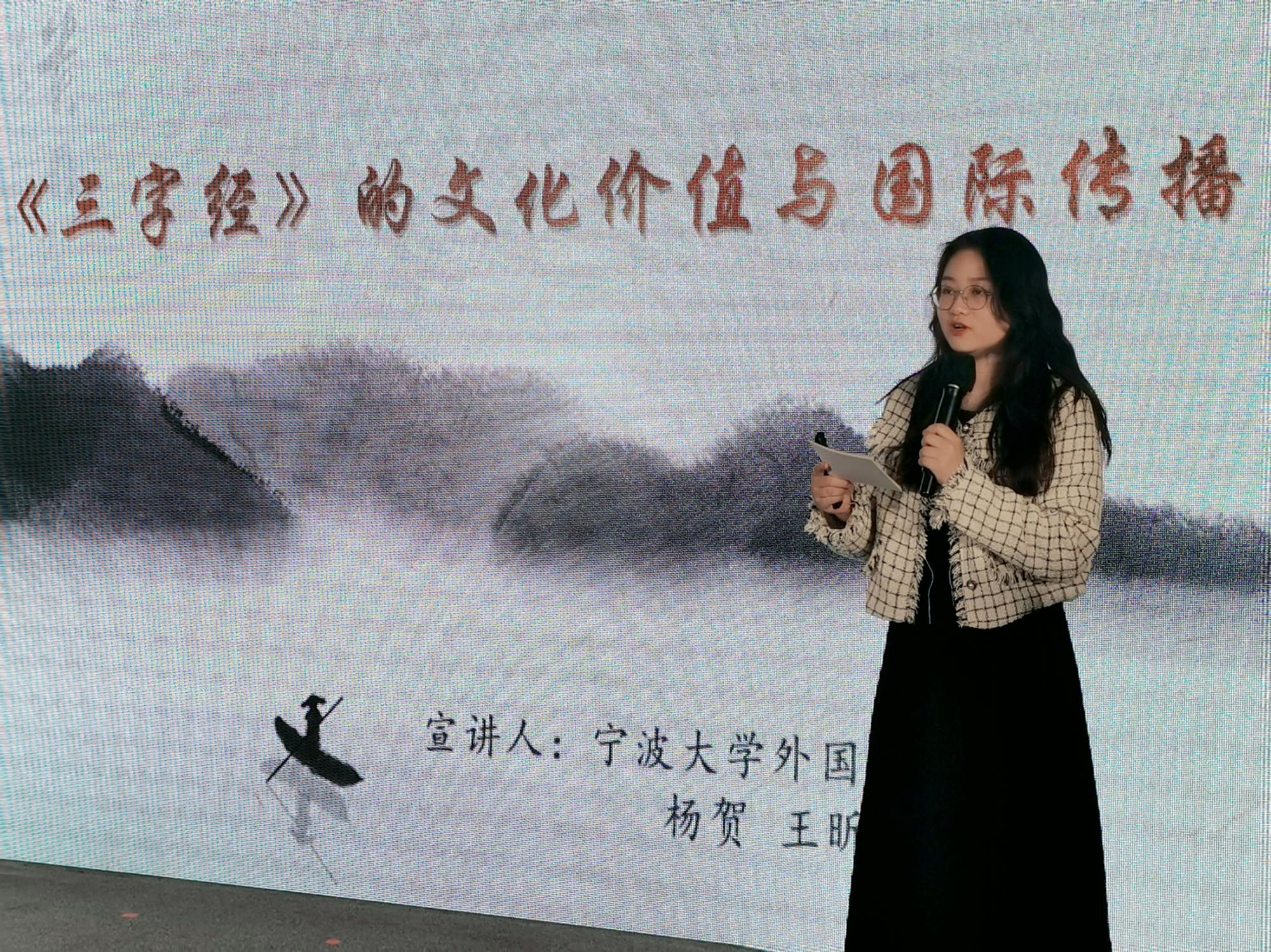 宣讲中,团队成员杨贺向观众介绍了团队的目标和成员组成、《三字经》的内容与格式,并以“昔孟母,择邻处。子不学,断机杼”“夏有禹,商有汤。周文武,称三王”等名言为例,从教育理念、历史等多角度阐明了《三字经》广袤而精深的文化内涵;以习近平总书记在二十大报告中的语句为引,阐明了《三字经》不可替代的重要文化价值;同时向观众展示了《三字经》在东亚文化圈和西方文化圈的传播现状。团队成员王昕雨以拉斯韦尔的“5W”传播模式为依托、分析数据样本,得出《三字经》对外传播在传播者、传播渠道、传播内容、传播对象方面存在的问题,并以问题为导向一一给出解决方案。最后,她还列举了团队在研究论文撰写、海外传播影响和双语文创产品制作等方面取得的系列成果。