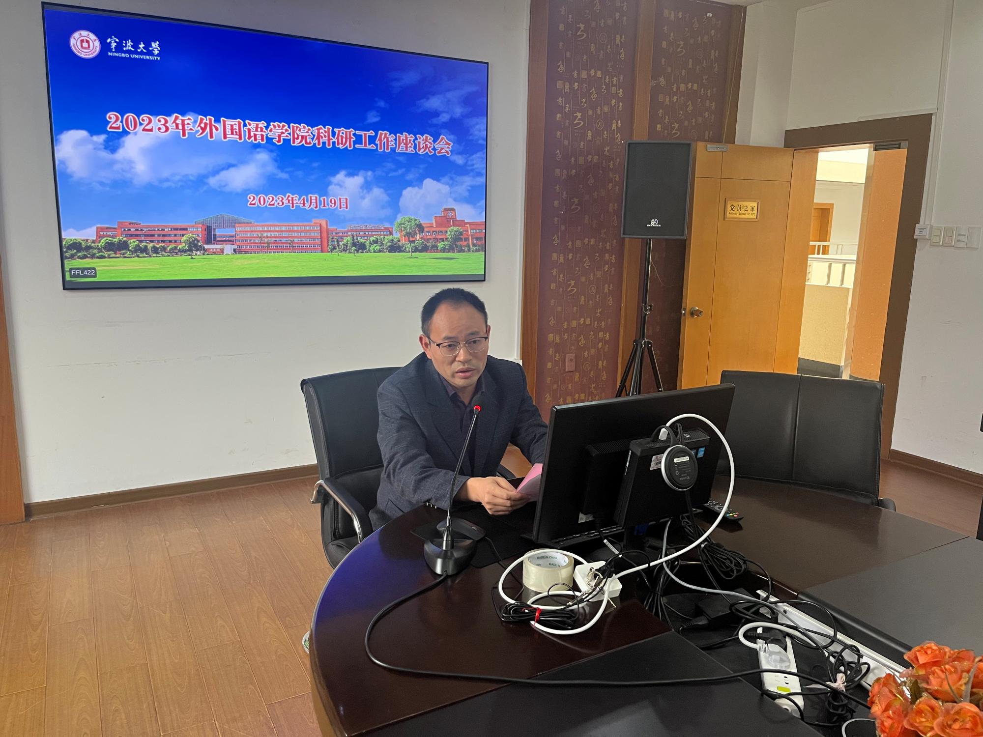 科研工作座谈会在李达三外语楼422会议室召开。座谈会由副院长陶久胜主持,院长屠国元、书记翁华星、副院长张陟、院办主任刘路平、MTI中心主任黄大网、日语语言文学点负责人张楠、德语语言文学点负责人张芸以及伊人直播