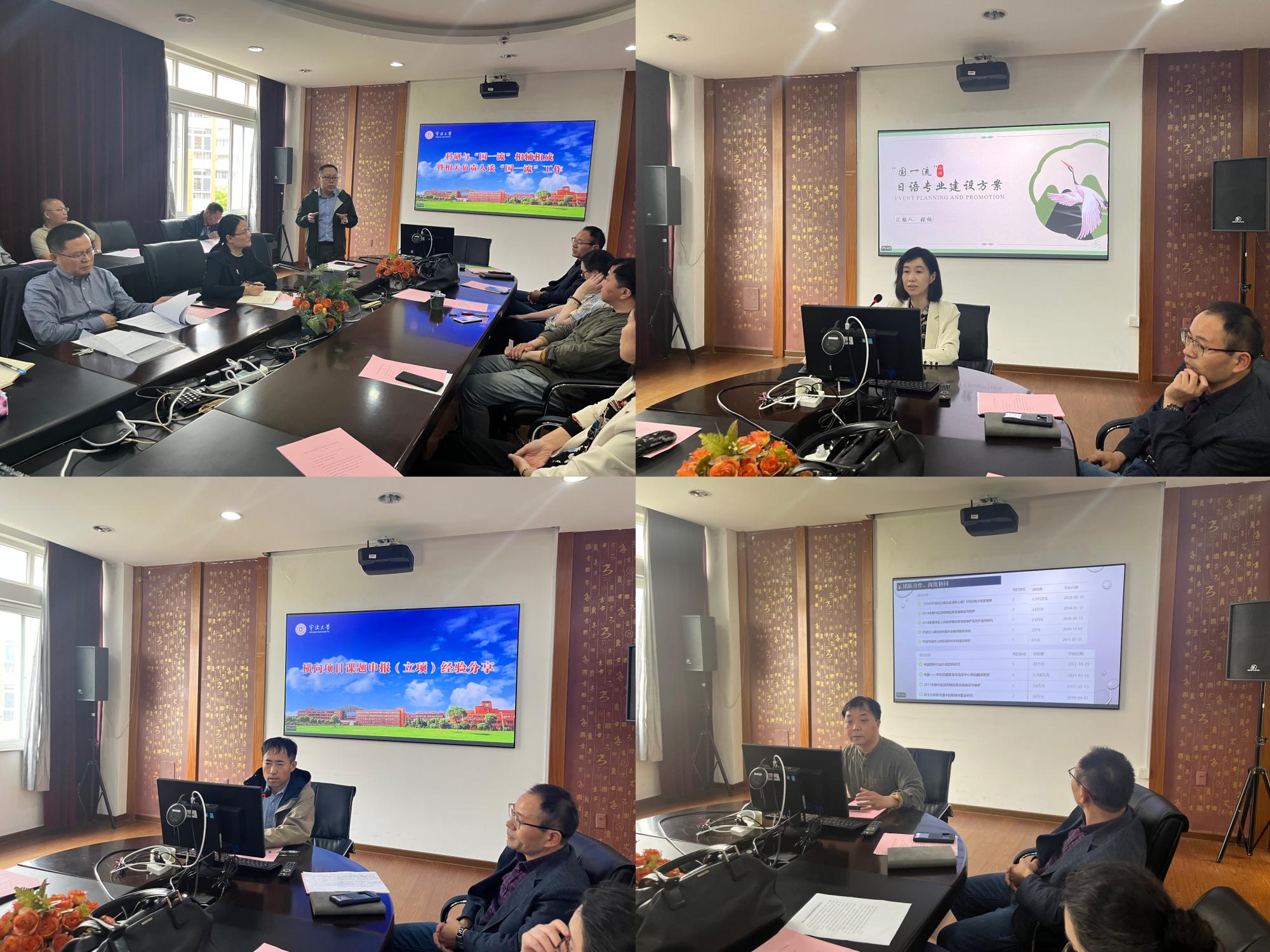 科研与“国一流”建设是相辅相成的关系。两位“国一流”负责人张陟副院长和张楠老师分别介绍了英语系和日语系的“国一流”建设工作。张陟副院长提出“国一流”建设首先要找好底线,也就是课程思政,当前就是做好“三进”工作;“国一流”建设要有所为有所不为,跟踪数字化智能化发展趋势,例如“知识图谱”等新进展;在五类一流课程建设中要重视“社会实践类”一流课程,让学生见识到宁波建设发展的新成就。张楠老师介绍了日语系“国一流”建设方案,提出科研服务于“国一流”,从课程、教材、教改、成果奖等方面设立了目标。院研究生办邹萍老师介绍了研究生培养方案修订工作情况。