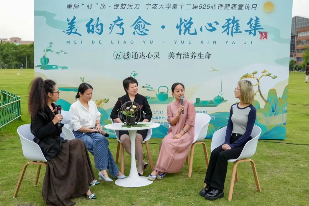 原阳明学院院长、“鹿鸣书友”读书会创始人卢美芬,宁波五一劳动奖获得者、全国绿化奖状获得者、海曙区绿化办副主任、高级园林工程师、高级园艺技师孙立军,国家级高级茶艺师、高级评茶员、“空山谷茶憩文化”创始人曹莉华,国家二级心理咨询师、“知悦”心理工作室创办人廖菁菁等嘉宾,以及学校宣传部副部长王湖清、学生处副处长张海华、心理健康指导中心主任米多、伊人直播