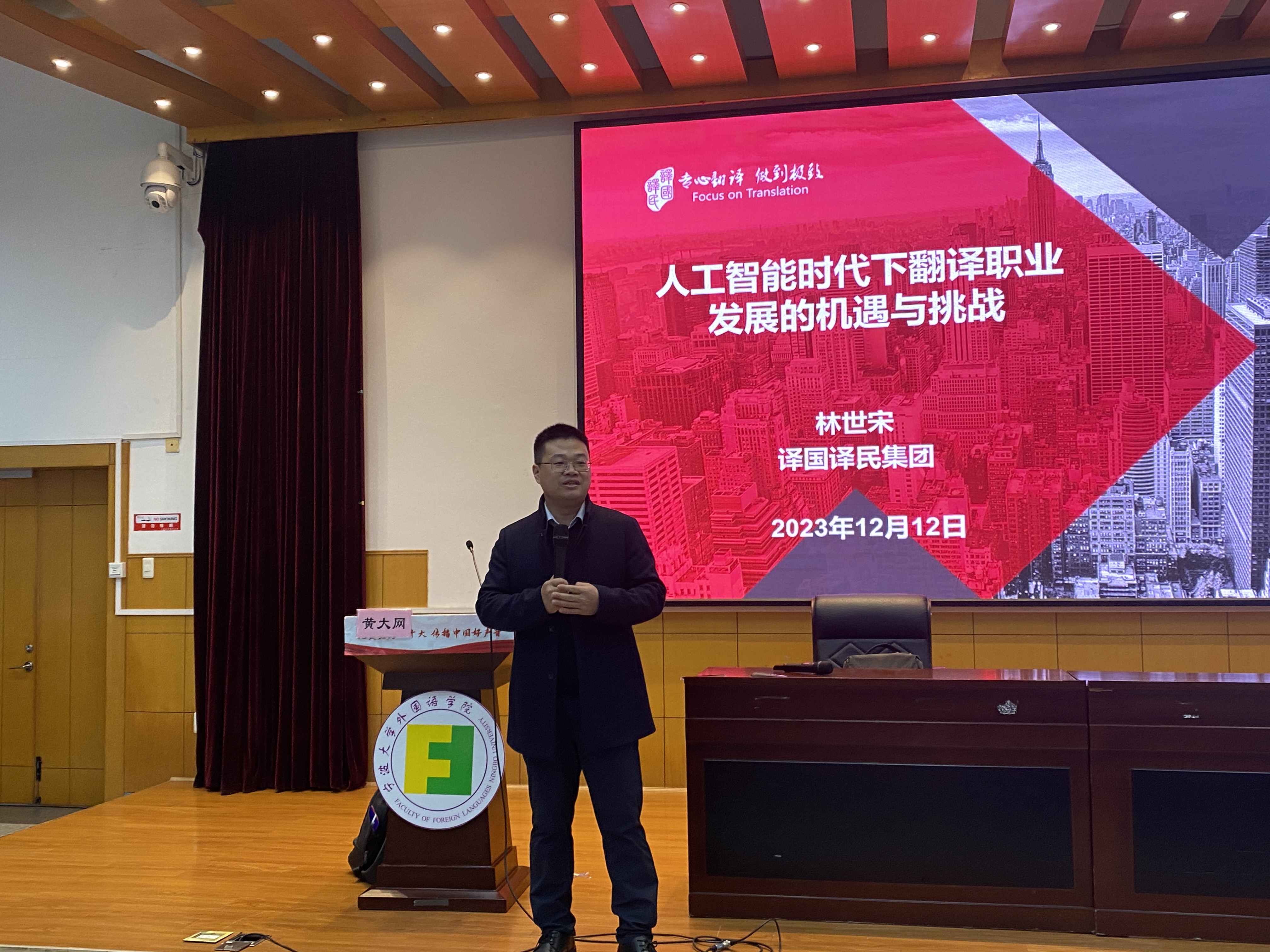 学生做了题为“人工智能时代下翻译职业发展的机遇与挑战”的讲座。作为二十年翻译行业从业者,林董与大家共同交流,探讨在人工智能时代,翻译行业面临前所未有的挑战的背景下,机器翻译是否会替代人工翻译,学习翻译是否还有前途,以及同学们如何应对挑战等问题。本次讲座由翻译硕士教育中心黄大网主任主持,学院师生近200人次参加了讲座。