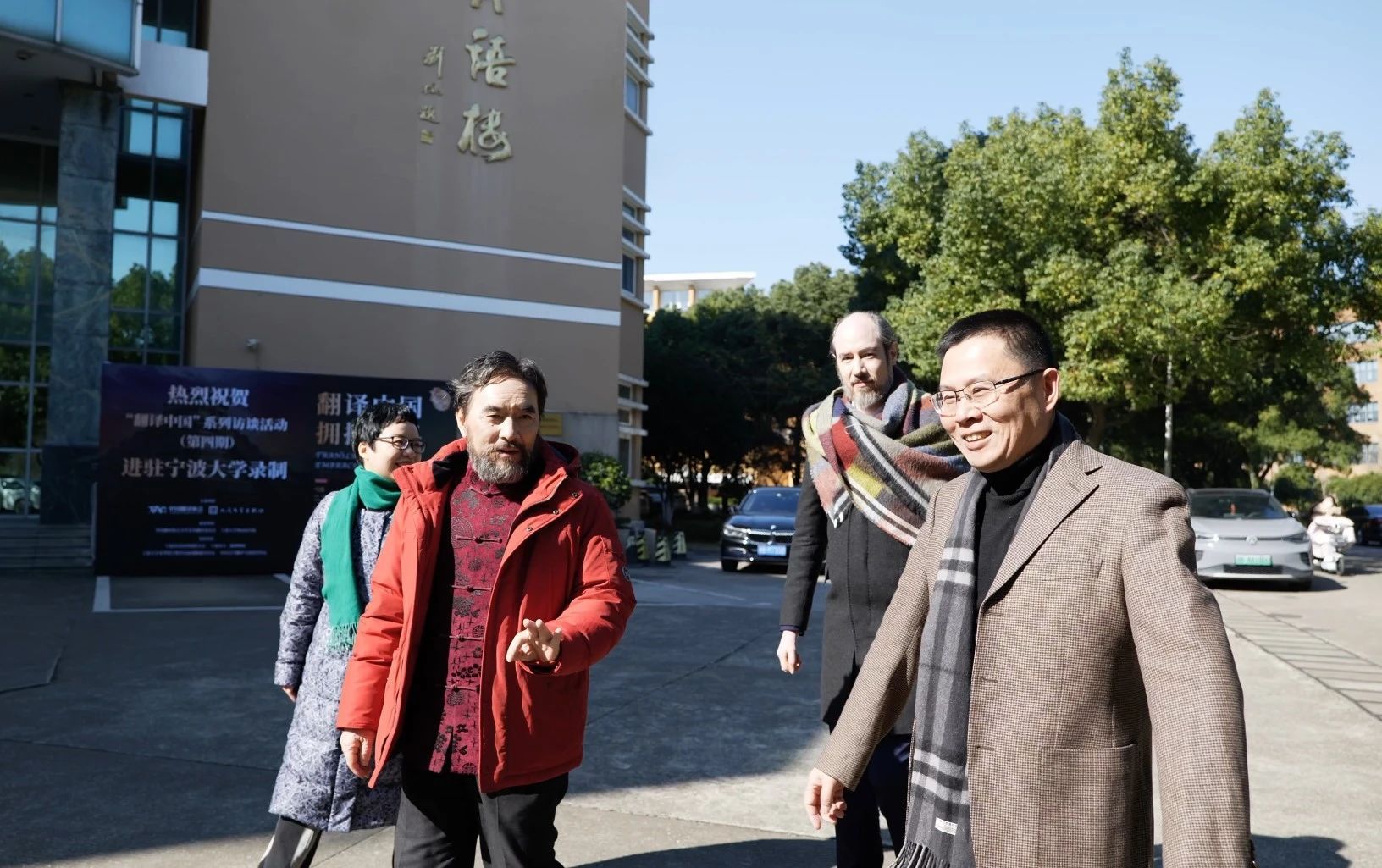 参加录制。主办方中国外文局翻译院院长黄玉龙、中国外文局翻译院翻译行业工作部副主任杜楠、人民文学出版社外国文学编辑室副主任陈旻等领导来甬指导项目拍摄。