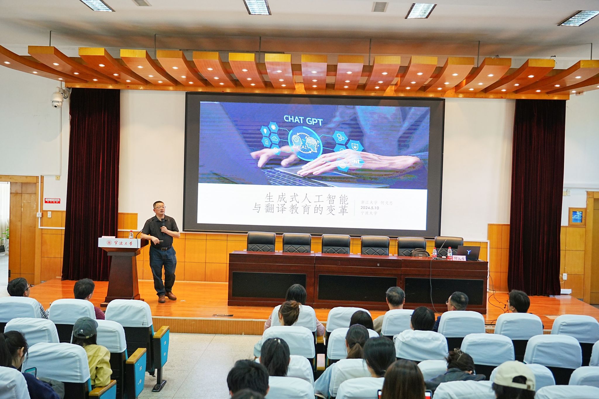 讲座中,何教授简要概述了生成式人工智能在各行各业的应用前景,紧接着深入探讨了生成式人工智能时代的外语教学研究,并以翻译为例进行详尽解析。何教授通过生动的案例和最新的研究成果,展示了生成式人工智能在提高学生语言水平、促进跨文化交流等方面的潜力,解读了生成式人工智能在翻译教学中的创新策略。
