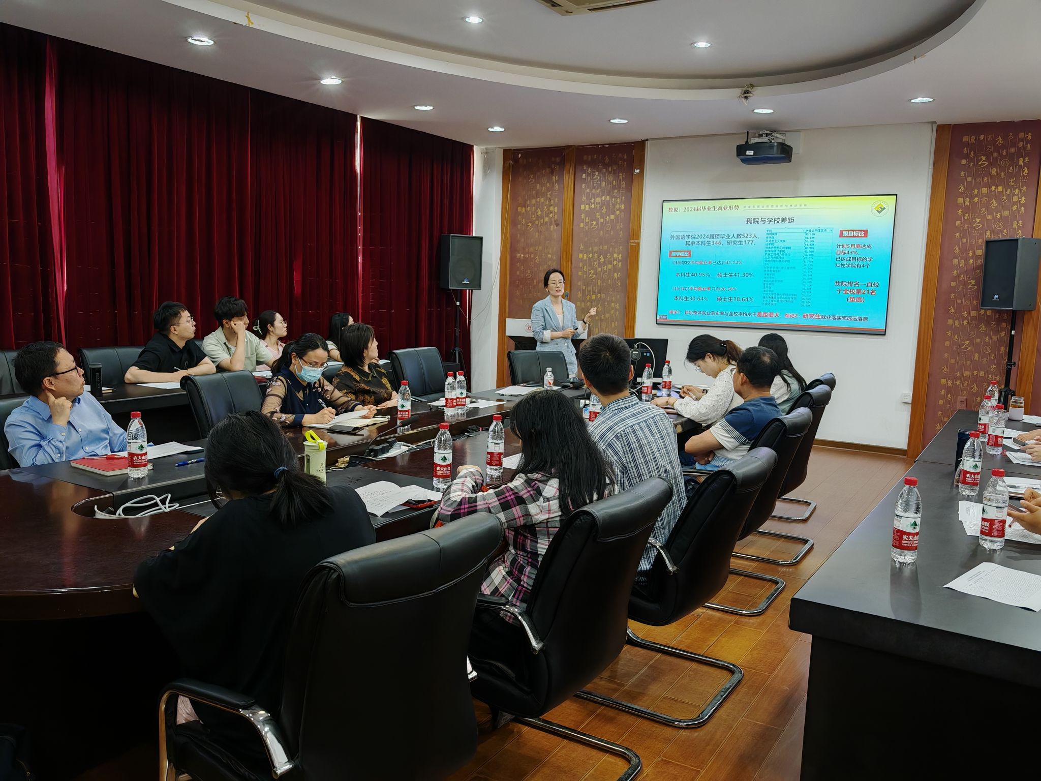 会议开始,学院学生工作负责人胡佳作了题为“抓紧抓快,全员动员,全面推进2024届毕业生高质量充分就业”的汇报。通过对比校院相关就业数据和就业排摸情况,分析了学院目前的就业形势、主要问题,介绍了学院推进就业工作举措和下一步工作要求,提出要强化全局意识、危机意识、责任意识,加大“一人一策”精准帮扶力度,全面提升学生就业能力,同时发挥导师、专任教师力量全员参与,抓紧推进就业。