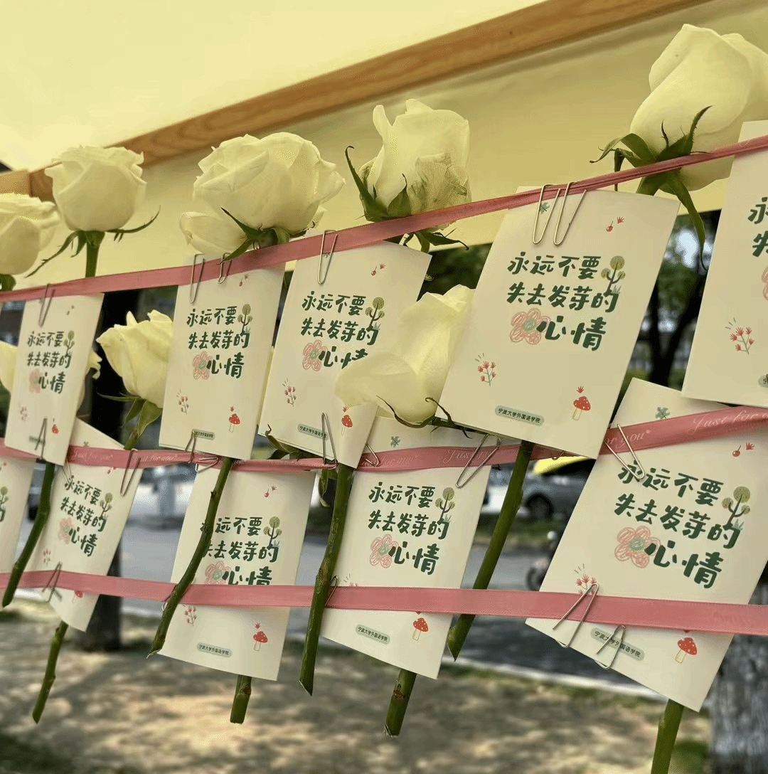 大草坪上的心理集市以成长为主题,以“成长N种解答”心理鼓励卡片为载体,借助学院师生书写的100余份“解答卡片”,帮助学生解答成长过程中的各种烦恼,用个性积极的文字鼓励他们更好地应对日常生活中的挑战和压力,实现心理“减负”,能量“增值”。同时活动现场还向同学们赠送了400余枝鲜花和100余份绿植盲盒,寓意着青年人永远不要失去发芽、开花的心情。