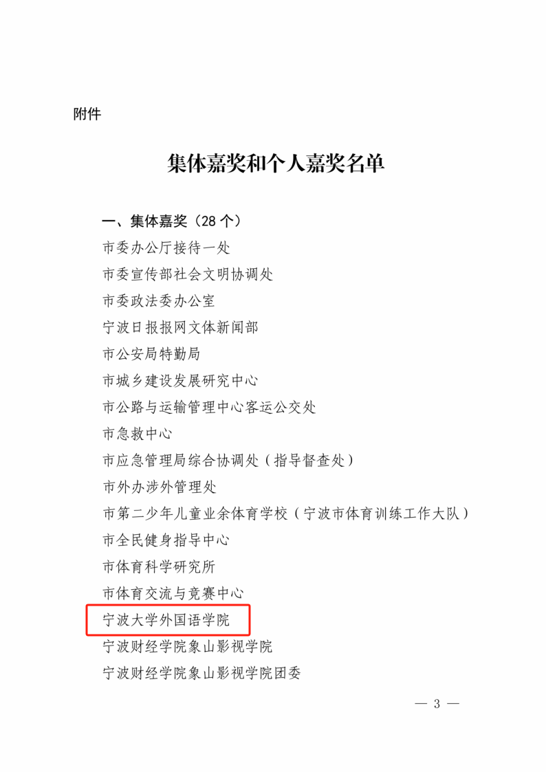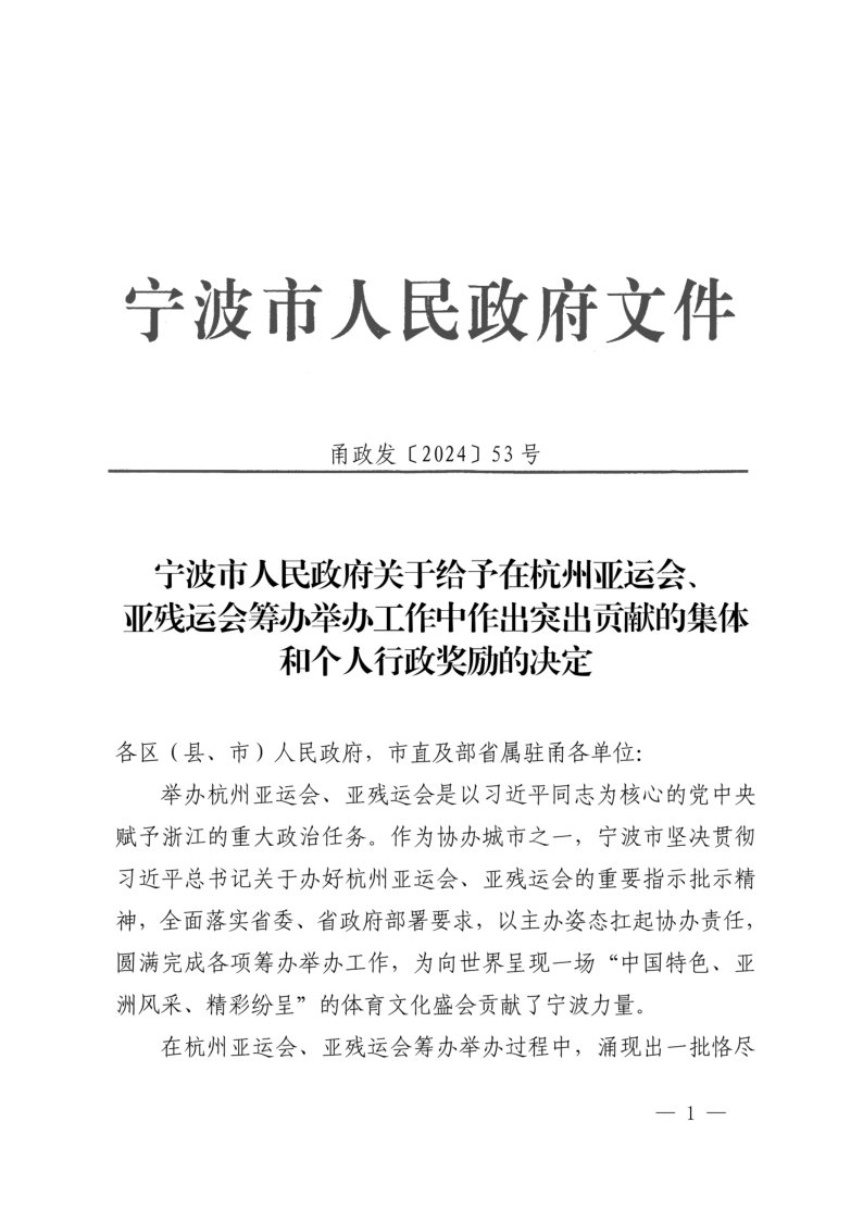 6月29日,宁波市人民政府发布《关于给予在杭州亚运会、亚残运会筹办举办工作中作出突出贡献的集体和个人行政奖励的决定》,对在杭州亚运会、亚残运会筹办举办过程中涌现出的恪尽职守、无私奉献的28个集体和84名个人给予嘉奖。伊人直播