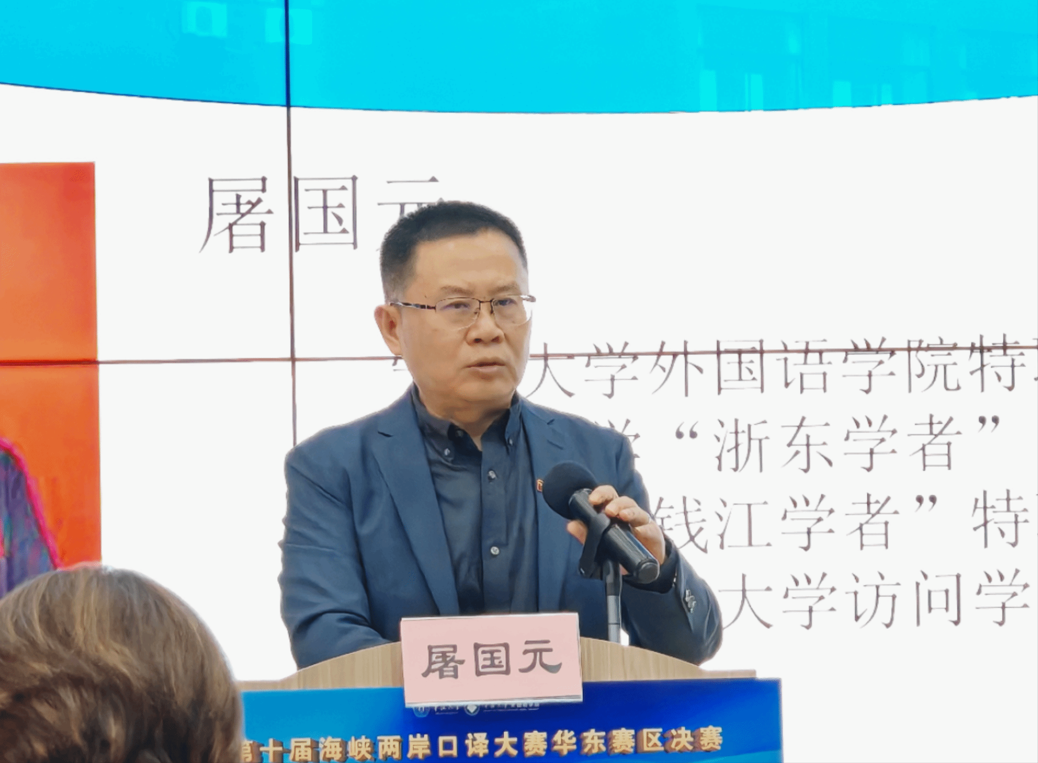 承办本次第十届海峡两岸口译大赛华东区赛深感荣幸。屠国元强调,学院将长期秉持立德树人的理念,注重提升教学质量,着力培养具有家国情怀和国际视野的外语人才。同时,期待优秀的口译人才在大赛中脱颖而出,为海峡两岸的交流与合作贡献青春力量。