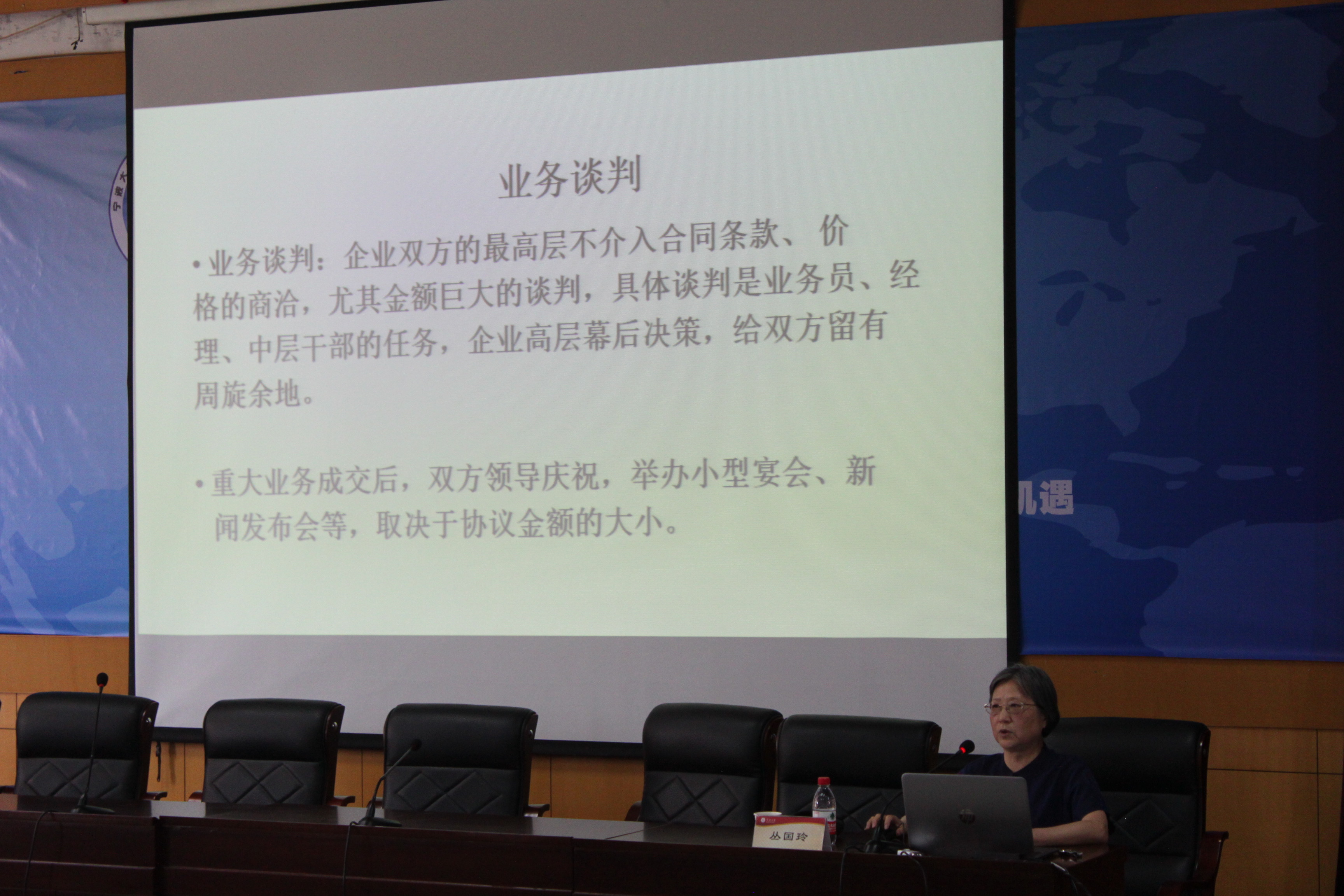 丛国玲女士首先简要介绍了她在原企业的三部分工作——翻译、进口业务及管理工作,并更进一步从“礼节性会见”、“业务谈判”“保密工作”等角度分别描述了作为翻译人员在涉外企业工作所要承担的职责。结合以上工作实例,丛国玲强调,做好口译必须也要动笔,笔译是口译的基础;同时,涉外企业活动的形式多种多样,做好翻译工作就需要不断充电,提高翻译素养。此外,译员应当扮演多面手的角色,主要承担“外事秘书”的职责,如负责外事杂务和财务管理等翻译以外的工作。另外不可忽视的一点就是注意对外礼仪和着装,守时守约,大方得体,尊重他人,如此方能为接下去的翻译工作提供良好的开端。在讲座的最后,针对外语专业毕业生就业应对面试的问题,丛国玲指出外语专业的学生要把翻译语言基础打好,并不断地在实践中扩大知识面以及积累经验,方能胜任翻译岗位。