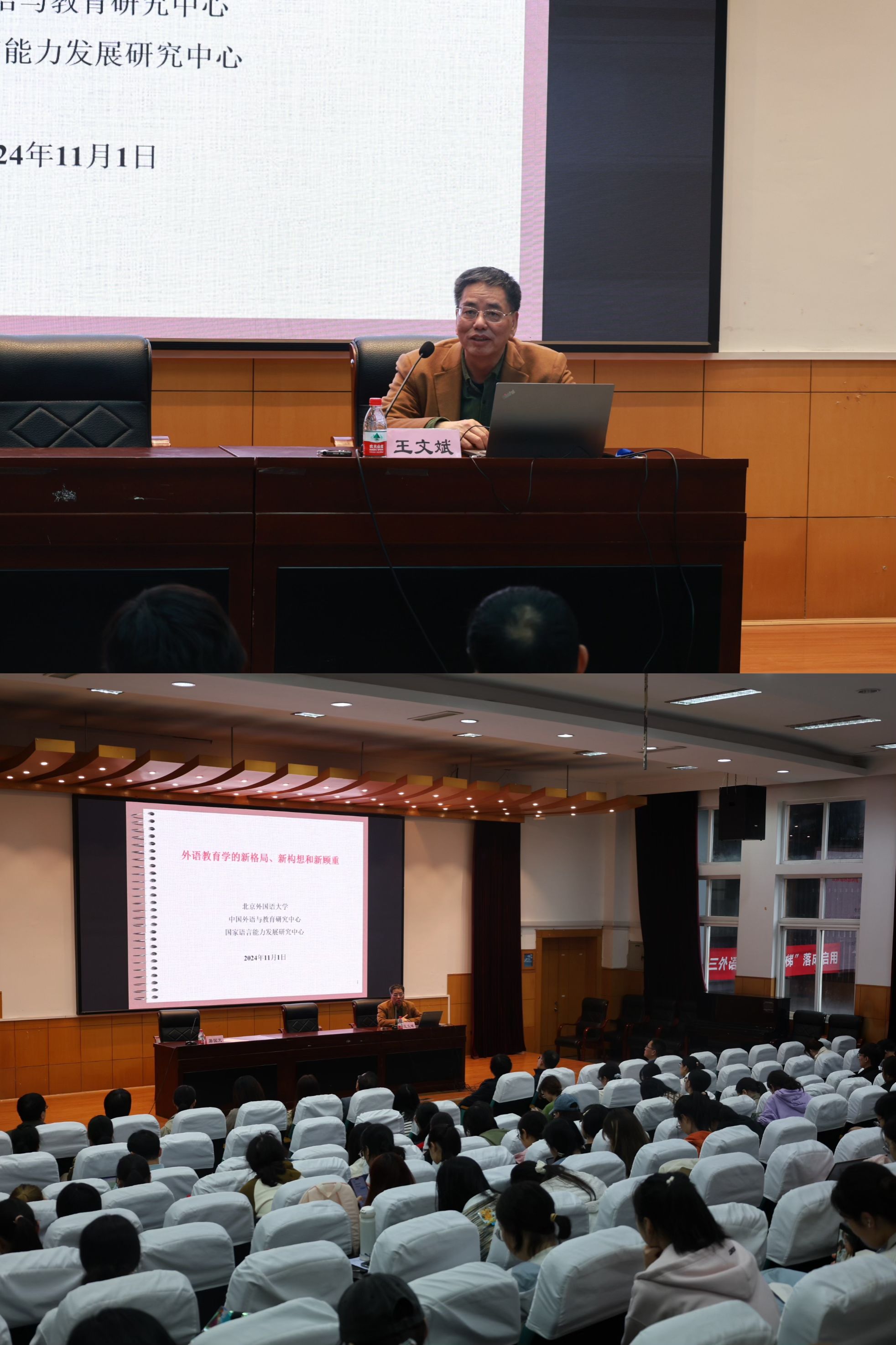 2024年11月1日下午,北京外国语大学教育部人文社科重点研究基地“中国外语与教育研究中心”主任,教育部高等学校英语专业教学指导分委员会副主任委员王文斌教授做客伊人直播 人文社会科学名家讲坛第436讲,在李达三外语楼218学术报告厅为学院师生做专题讲座。此次讲座由学院特聘院长屠国元教授主持。王文斌教授以《外语教育学的新格局、新构想和新顾虑》为题,围绕外语教育当前存在的问题、外语教育的新格局以及外语教育的未来发展构想等方面进行了深入阐述和剖析。讲座伊始,王教授深入阐述了外语教育当前存在的问题和面临的挑战。他认为,随着人工智能在教育领域的广泛应用,为国家培养高质量的外语人才,是外语教育的新使命、新担当;外语教育的新格局应更加聚焦于母语语言修养的提升、更加注重培养隐形文化的理解能力以及弹性的思维能力,更加注重外语教育实践等。他旁征博引,通过详细解读国内知名大学校名的深刻内涵,强调了提升母语语言修养的必要性以及准确理解隐形文化的重要性。为此,王教授建议外语教师和学生应大量阅读文学作品。围绕弹性思维能力的培养,王教授通过“云山”和“家和万事兴”的英文翻译,深入阐释了外语教育过程中如何培养学生的灵活思维能力以及语言表达的创造力。围绕外语教育实践,王教授提倡外语教师应敢于突破固有的教学框架,采用创新的教学方法,并运用恰当的教学语言来实施个性化的教学方案,进而提高外语教育的教学效果和学习效能。关于外语教育未来发展的构想,王教授强调,外语教师应了解掌握人工智能技术,充分利用ChatGPT类大语言模型等数智化带来的便利。屠国元教授在总结讲话中表示,王文斌教授的讲座高屋建瓴,对广大外语教师和学生全面、深刻理解《外语教育学的新格局、新构想和新顾虑》具有全新的指导意义,对外语学科的建设、人才培养制度的创新等方面提供了实践路径。