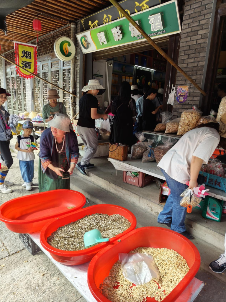 而后,嗅着喷香的瓜子味,循着戏调一般的叫卖,转角走进商铺中。街边喷香的瓜子,店中淳朴的卖家,一交一易将好客之情传达给外院游客这样充满人间烟火气的小店,来丰惠不体验一把,不算来过。老师们有说有笑地走进店里,寻觅小吃,挑选商品。