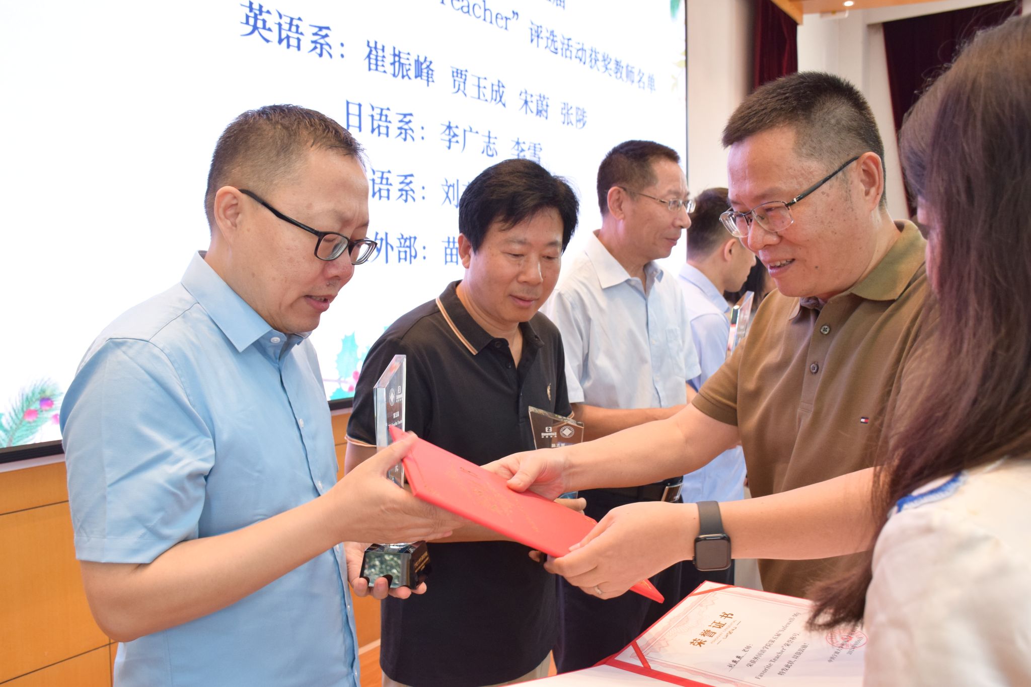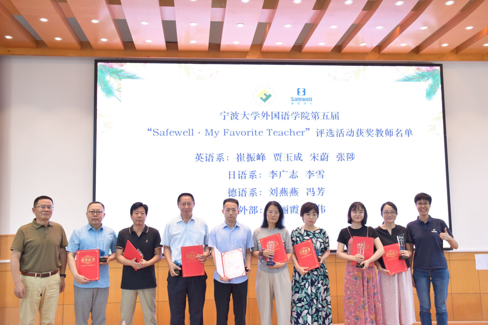 在全院教职工大会上举行了第五届“Safewell· My Favorite Teacher”评选活动颁奖仪式。德语系2011届校友、盛威卓越国际贸易有限公司总经理叶凌玲及其团队成员与学院党政班子成员、各系部办教职工、学生代表等160余人参加了活动。活动由学院党委书记翁华星主持。