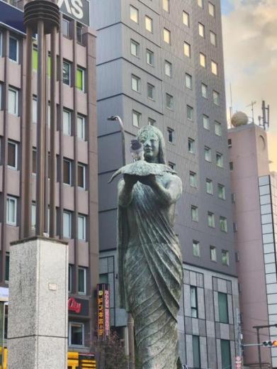 When I first arrived in Japan, I was captivated by the sculptures and architecture lining the streets. One particular statue (image 1), set against a backdrop of towering skyscrapers, symbolized the harmony between modern urban life and traditional artistry. A pigeon happened to perch delicately on the figure’s outstretched hand, bringing an unexpected sense of vitality to the stillness of the sculpture. To me, this encapsulated Japan’s unique charm—a place where order and nature coexist seamlessly, where even the smallest moments are infused with beauty.