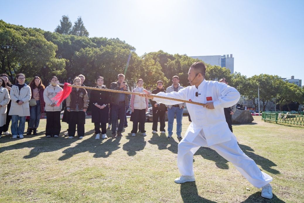 As guests stepped onto the lush green lawn of Ningbo University, they were greeted by the majestic Clock Tower and intricately carved olive tree donated by alumni. Amidst this picturesque setting, an outdoor experiential class for the international course "Intercultural Communication" was in full swing, led by Associate Professor Cui Zhenfeng, a master of Bajiquan martial arts and a member of the bilingual teaching team.